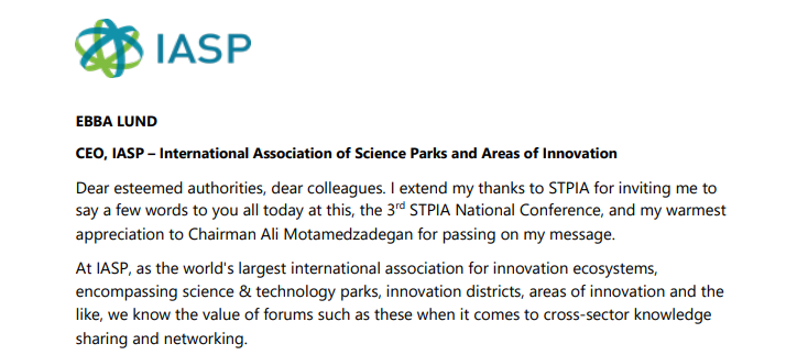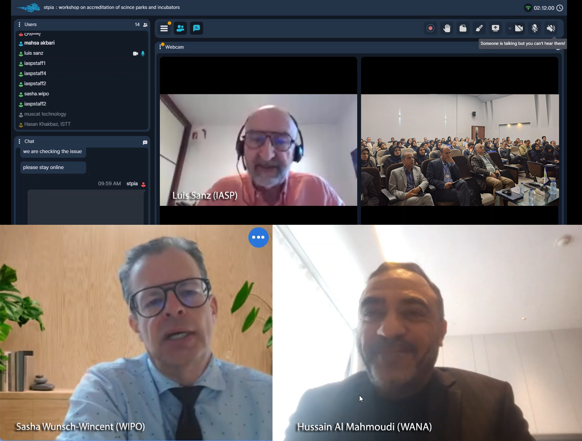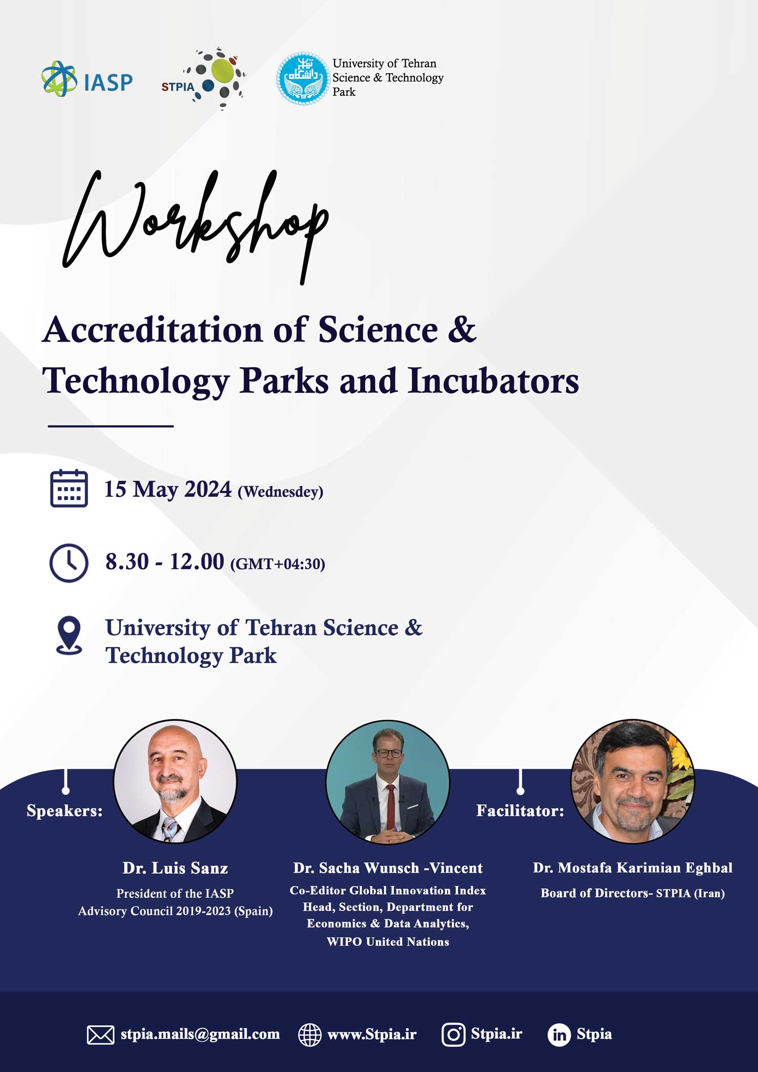 In the opening panel, Ali Motamedzadegan, the chairman of STPIA, Zahra Mohammad Hashemi, the deputy of the technology infrastructure development office, and Iraj Alahdadi, the deputy of technology development in Science and Technology Park of Tehran University were present, while welcoming the guests, the workshop's objectives were discussed, and the importance of evaluating the performance of innovation organizations in improving their progress was emphasized. In the following, Dr. Ali Motamedzadegan gave explanations in English about the objectives, programs and missions of the association.The first panel started with the speeches of Hossein Al-Mahmoudi, Luis Sanz, and Sasha Wunsch Vincent with the facilitation of Mostafa Karimian Iqbal who presented their content and important points regarding the evaluation and ranking of science and technology parks.First, Hossein Al Mahmoudi, the head of the West Asia and North Africa (WANA) division in IASP, pointed out the impact of this division's role in creating communication in the IASP organization, and further emphasized the importance of the concept of evaluation in the performance of all innovation organizations in the world, saying that through evaluation, organizations can achieve a standard evaluation structure to use that structure for their growth and development.Then Luis from IASP talked about the promotion of the organization's brand as an advantage of membership in associations and added: that what is important is the credibility of the institution that performs the evaluation process; Sometimes only the certificate is exchanged between the assessor and the assesses, or sometimes the assessment is not comprehensive and only has a local or regional aspect.